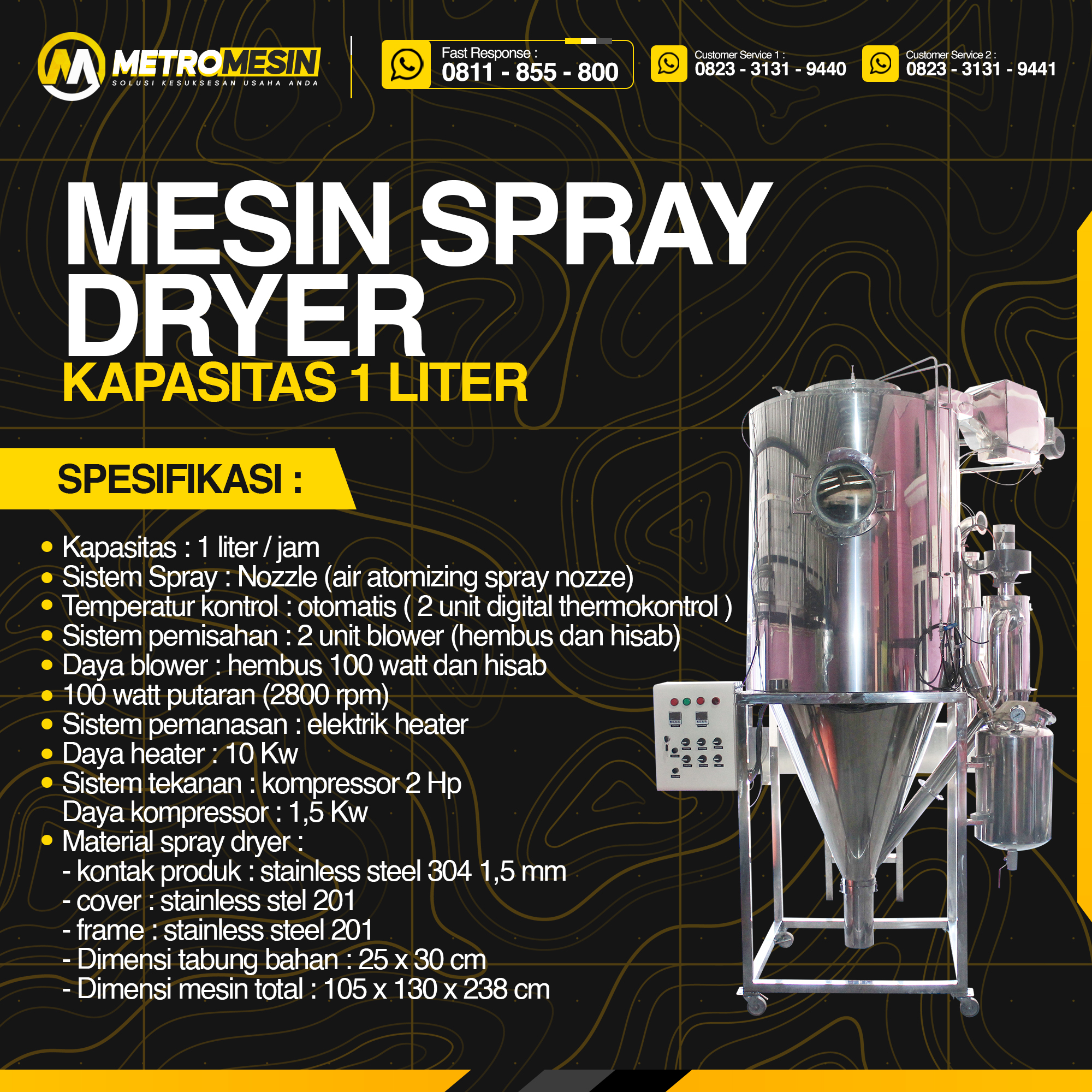 PT Metro Mesin Mendunia menawarkan Mesin Spray Dryer dengan spesifikasi yang dirancang untuk kinerja optimal dan daya tahan:
