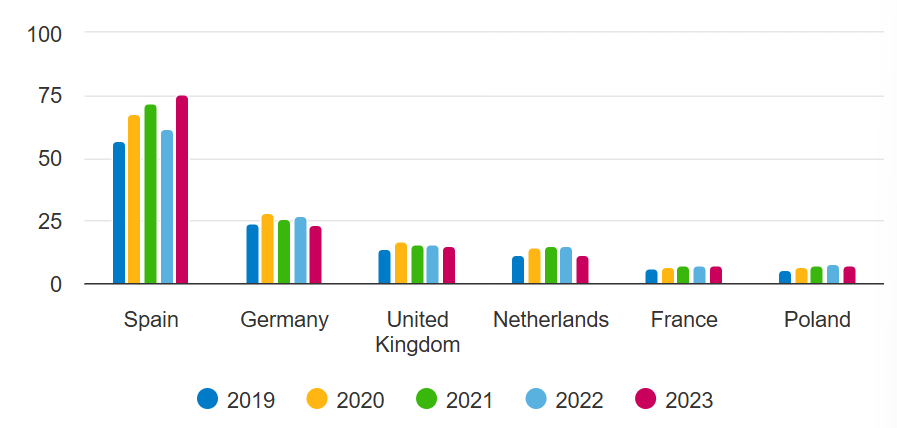 Negara-Negara Pengimpor Cabai Merah Kering Terbesar di Eropa Dalam 1000 ton Berdasarkan Statistik dari UN Comtrade, Agustus 2024